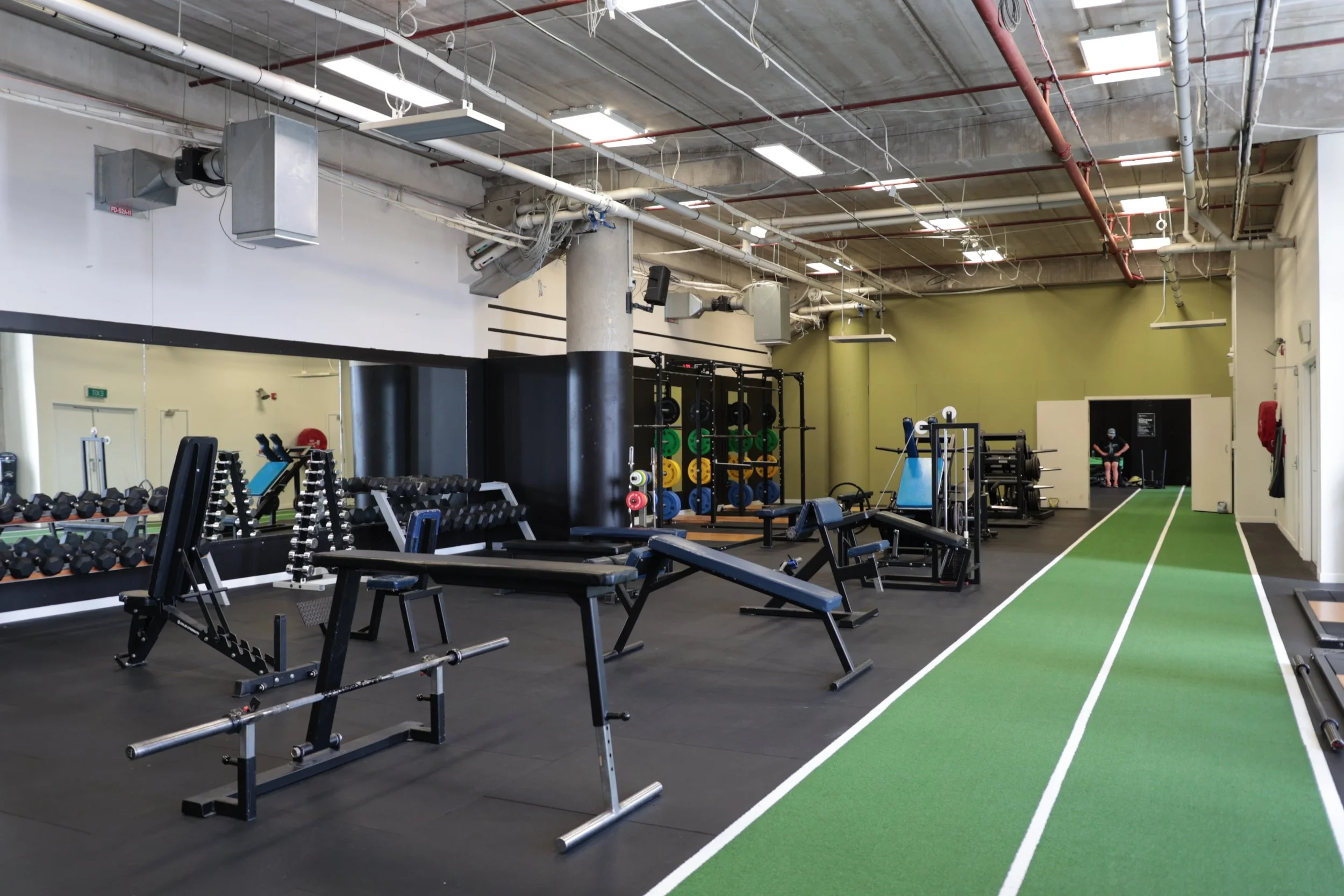 We’ve built our space for athletes. Split into five training zones, which includes: a training studio, 9 x lifting platforms, a 40 metre astroturf track, jungle gym, sleds, rings, ropes, plate loaded machines and more.